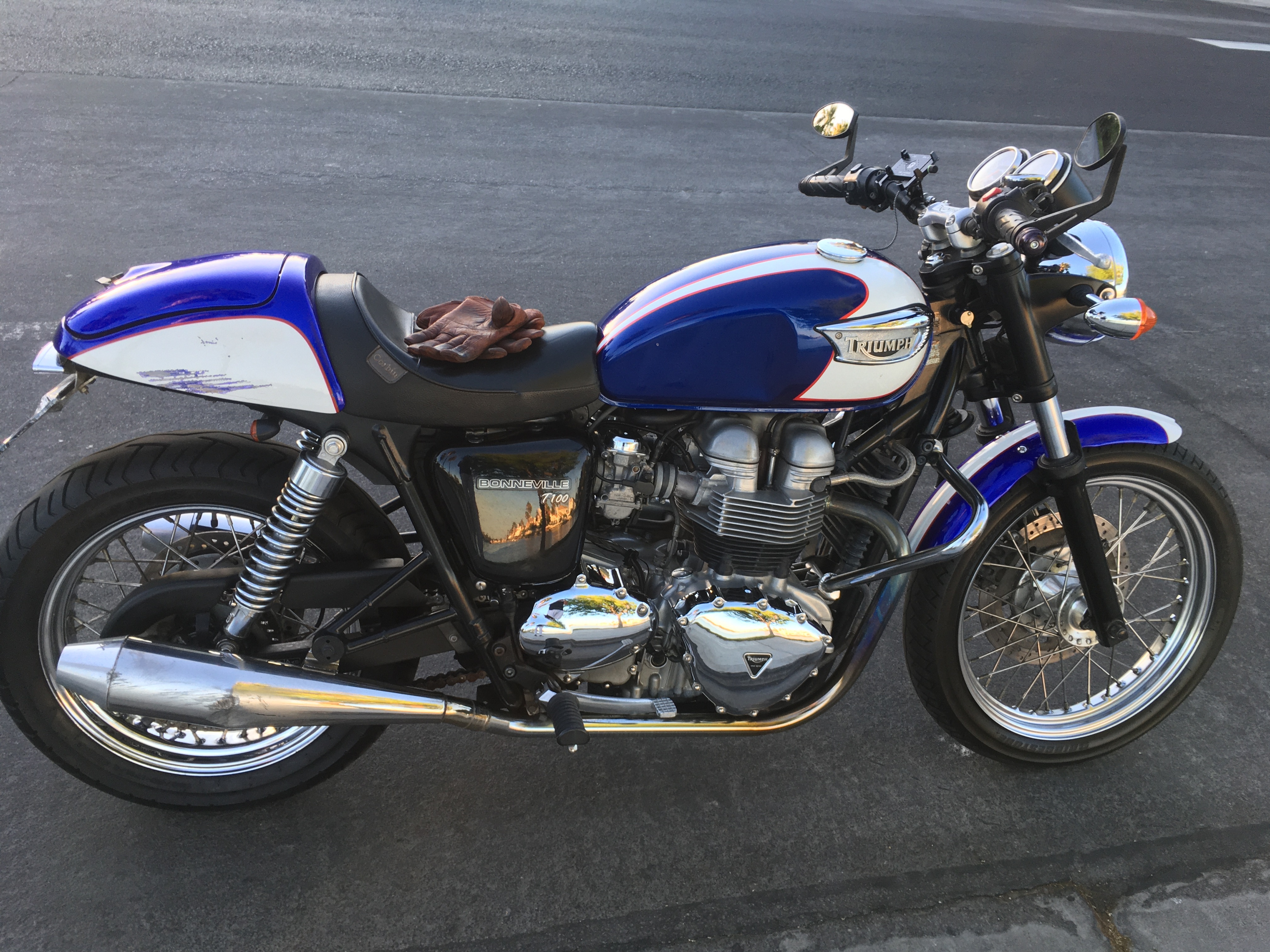 Well now that I'm getting to now everyone I figured I needed to do a quick touch up of the road rash on the cowl of the seat. Since I was born the same year as the Bonneville I took the logo from the 2009 50th anniversary edition and modified it to cover the road rash, laser printed it on mylar and voila! Just a quick patch till I have time to re-paint.