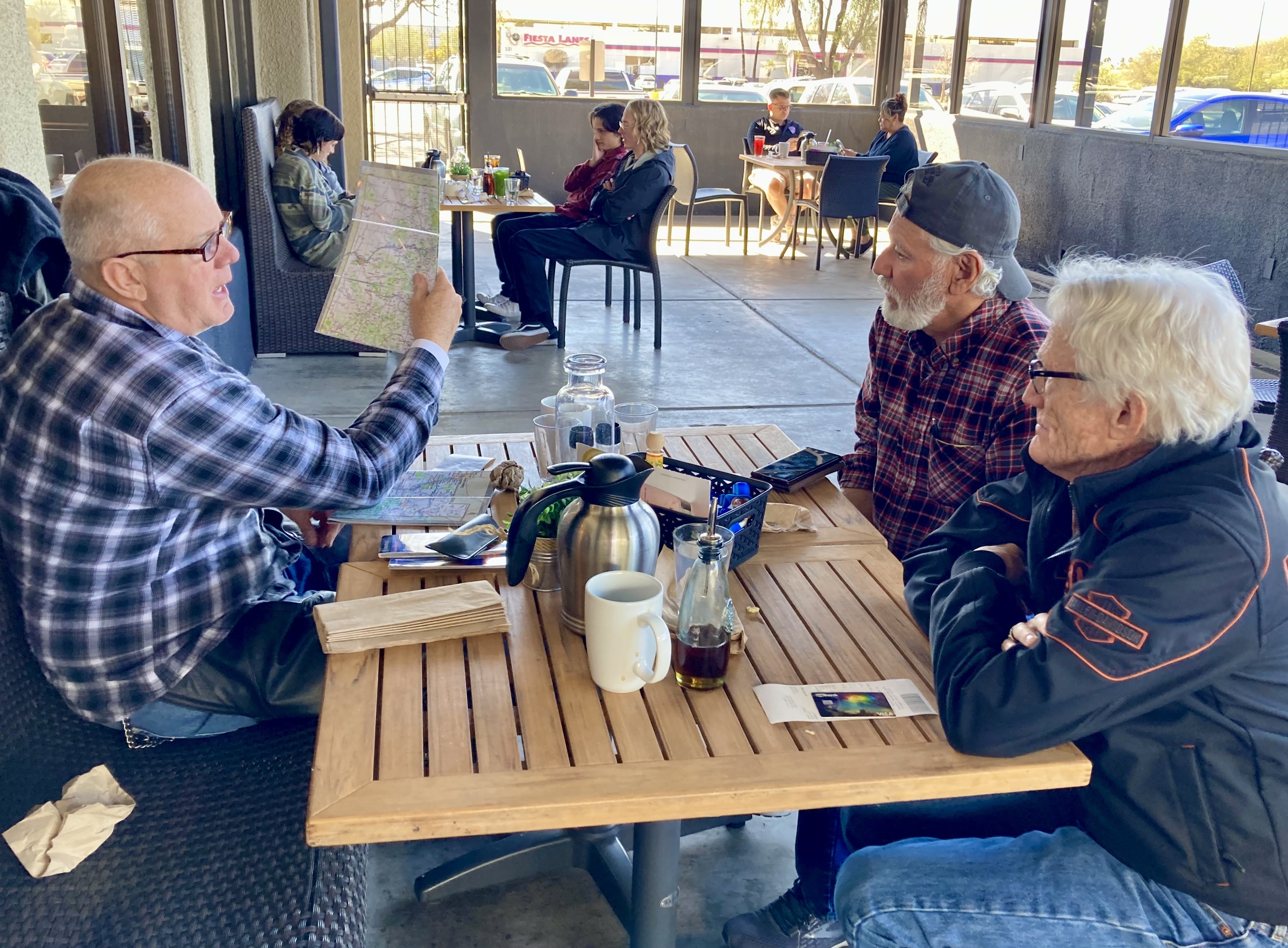 We also spent time over breakfast planning for our big summer trip That trip will be 8 days / 7 nights and include northern New Mexico, Colorado, and northern AZ. Steve had e-mailed the group with a tentative plan and today we poured over the maps to nail down some details.