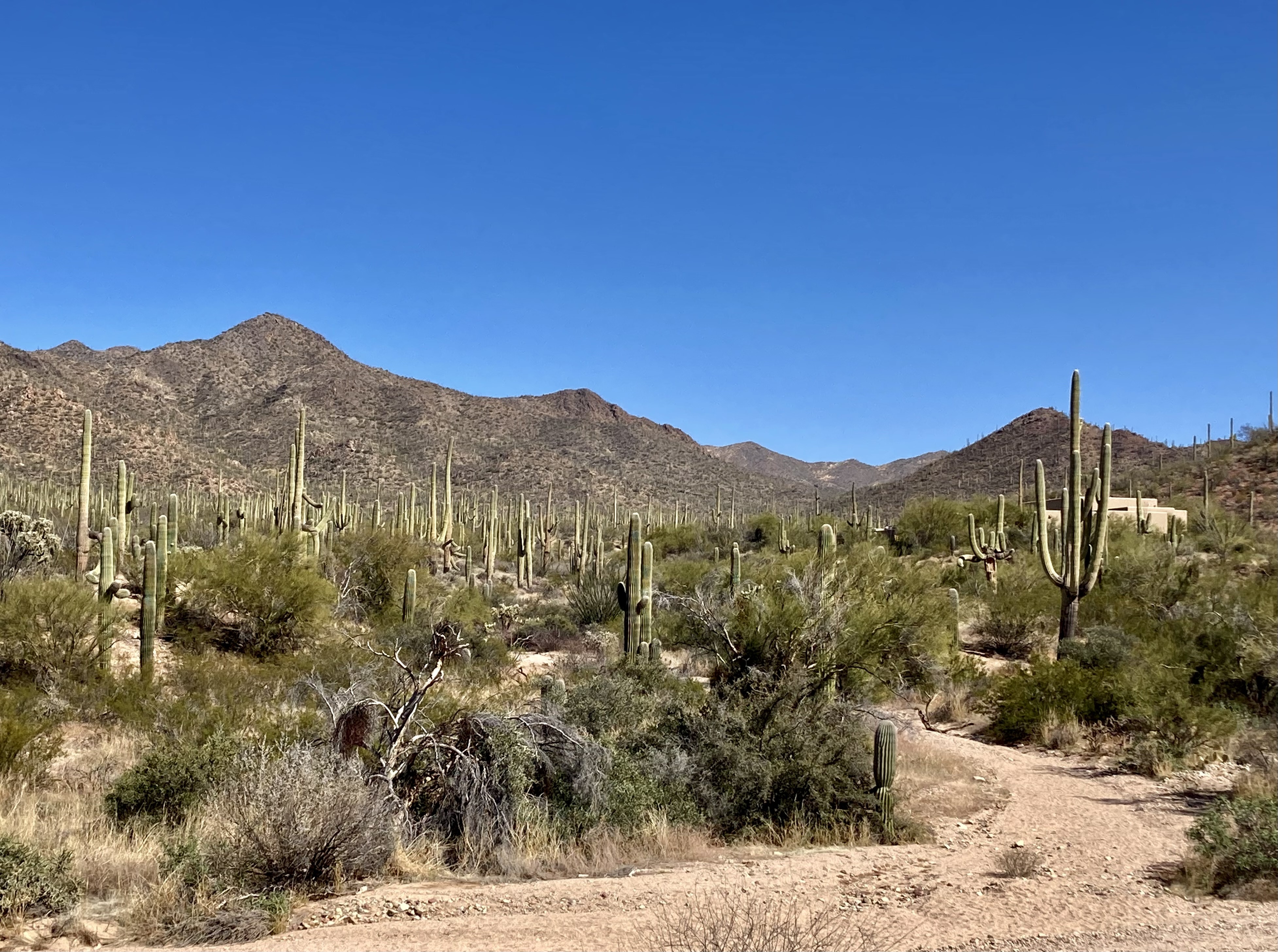 Red Hills Visitor Center in Saguaro National Park -- today it was packed with more people than I've ever seen here! The weather was terrific--sunny blue skies and temps around 60ºF. Out of all the vehicles in the parking lot, we only saw one with Arizona plates so there are lots of "snowbirds" and winter visitors in town.