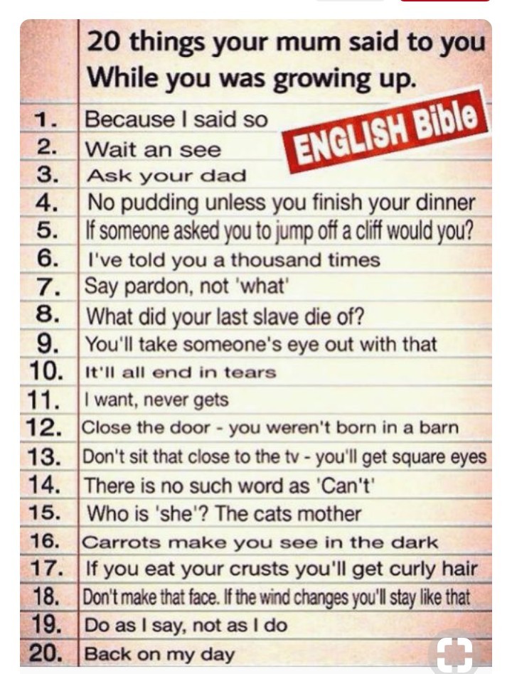 Number 9 was a quote by King Harold. Number 14 is a mis-quote. The correct quote was given by my physics teacher (who was a bit deaf). He'd just given us some homework to do during the school holidays. Someone shouted out "you cnut" !, to which he replied "I can you know". Number 17 was always said to me and I already had curly hair which I hated. I used to wet my hair and comb it flat but it just went curly again. I later learned that girls liked curly hair so my opinion changed slightly.