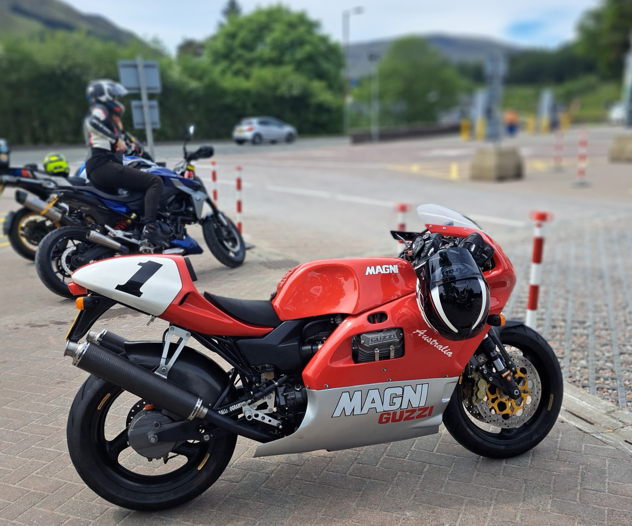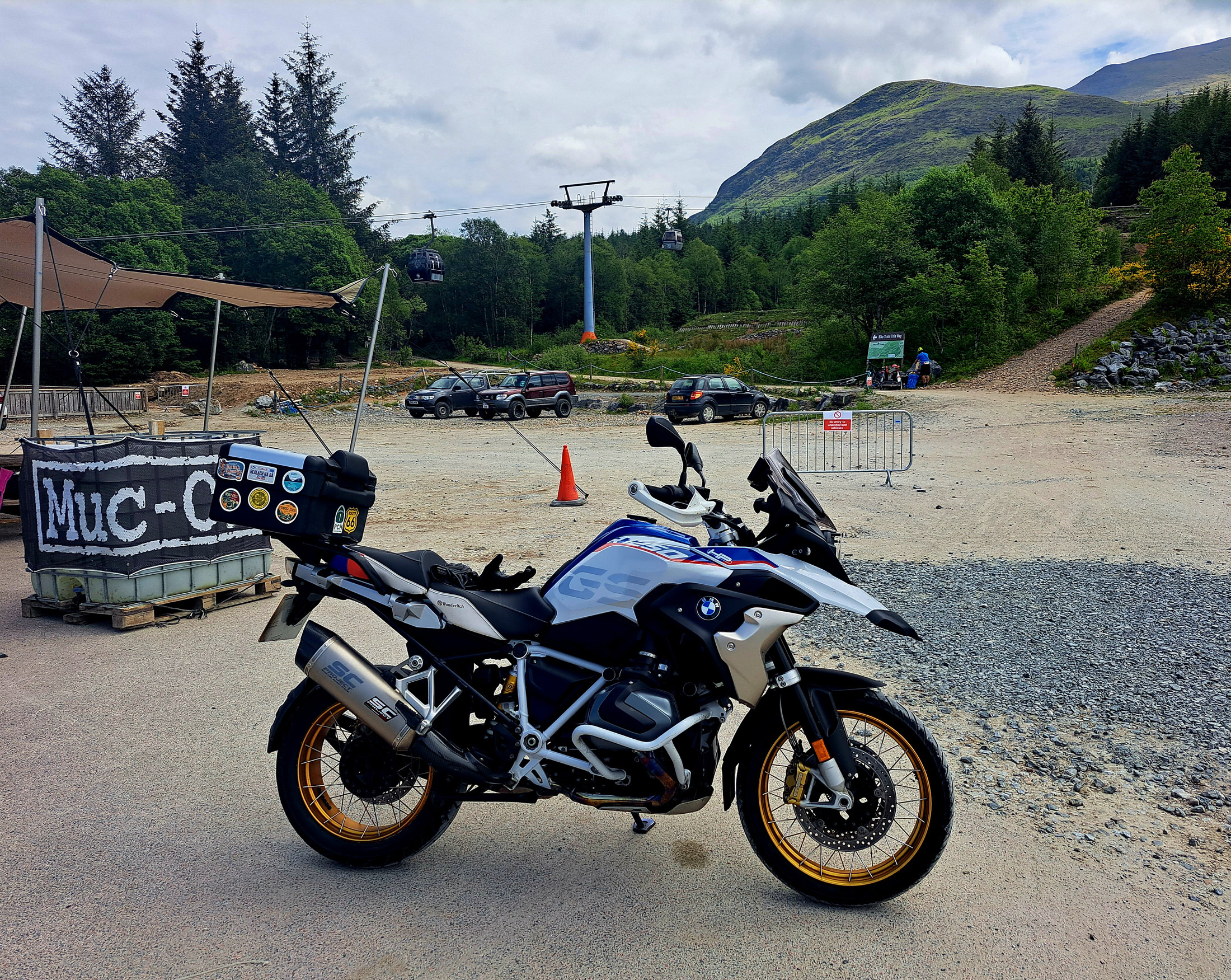 On the A890 overlooking Loch Carron and of course once you get to Eilean Donan Castle you have to stop for a couple of photos one from each side of the water this view is just of the A87 carried on the A87 until Invergarry where i joined the A82 just south of Loch Ness. stopped of at Nevis Range just about 5 miles north of Fort William from there i went through Glen Coe which in the sunshine looked great, i stopped off at the Loch Tulla viewpoint for a quick picture The next and last stop before home was the green wellie for fuel, saw this Magni Guzzi in the bike park I had a cheese cake at TJs, a bit of America in Tyndrum, it looked quiet but everyone was sitting outside i had a brilliant time, i could have done it in one day but then i wouldn't have seen near as much and it would have been a long day as the total mileage was just over 500 miles (that includes the trip after my evening meal to Red Point and the run up the Bealach na ba), so splitting into 2 days made a lot more sense. my normal mileage for a days run is usually between 200-300 miles as that still gives you time for plenty stops, I'll definitely be doing more of this overnight trips in future