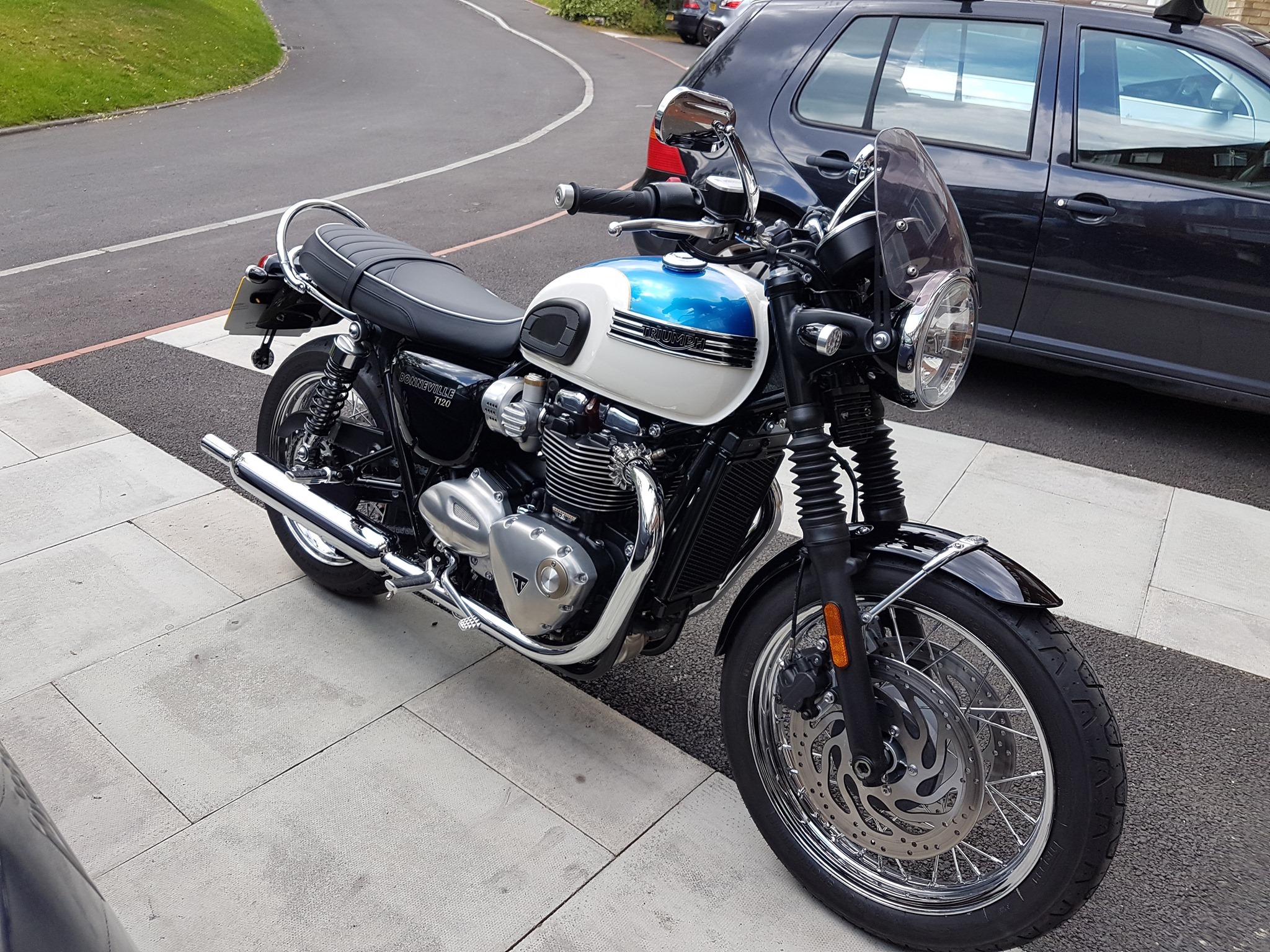 Hello fellow Triumph Bonnie owners. I owned my 2005 Opal & Tangerine T100 for 10 years and rode about 43K on it. I loved that bike but I had a hankering for a T120 and this week I collected a 2019 model. Like everyone else I immediately swapped a few components. My dart flyscreen from the T100 fitted right over, I'd picked up a really nice pair of Triumph chrome oval mirrors in a sale for just £25 and they look great I think. You have to move your elbows in for a decent view but I don't mind that. As soon as the rain stops I'm going to fit these Motone pannier rails as I like to use saddlebags. On that note my trusty 1970's 'Swagman' bags have done the job for the last 8 years or so, am thinking about a higher end upgrade in that department though. I've hardly had a chance to ride more than a few miles so far but I really love how this bike feels. The heated grips got used on the way back from the dealer. I also tried out the cruise control that I had fitted, that seems an excellent development for me. Very much looking forward to a decent run out soon.