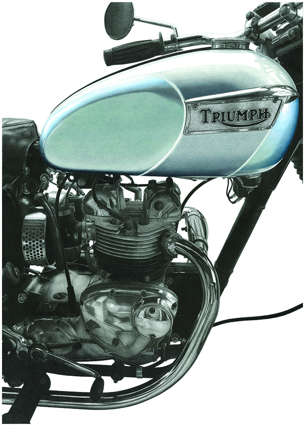 Hey guys, I'm very new to this and I must confess I don't own a Triumph (yet) - but I love them. I just finished an epic 150hr illustration of one and the end result was far better than I could have imagined. I have photos of others I've seen on the street I'd like to draw, but thought it would be amazing to draw someone's pride and joy! Let me know if you're interested. This one is for sale! Graphite and colour pencil. 770mm (30") x 550mm (22")