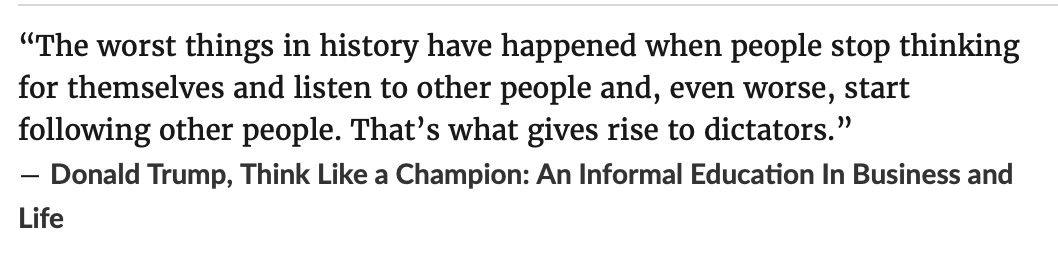 A couple of days ago I ran across a link to a large number of Donald Trump quotes from over the years, most all from books he has written. I thought this particular quote was rather "interesting" in light of his political leadership style and especially in light of his words and actions since the election.